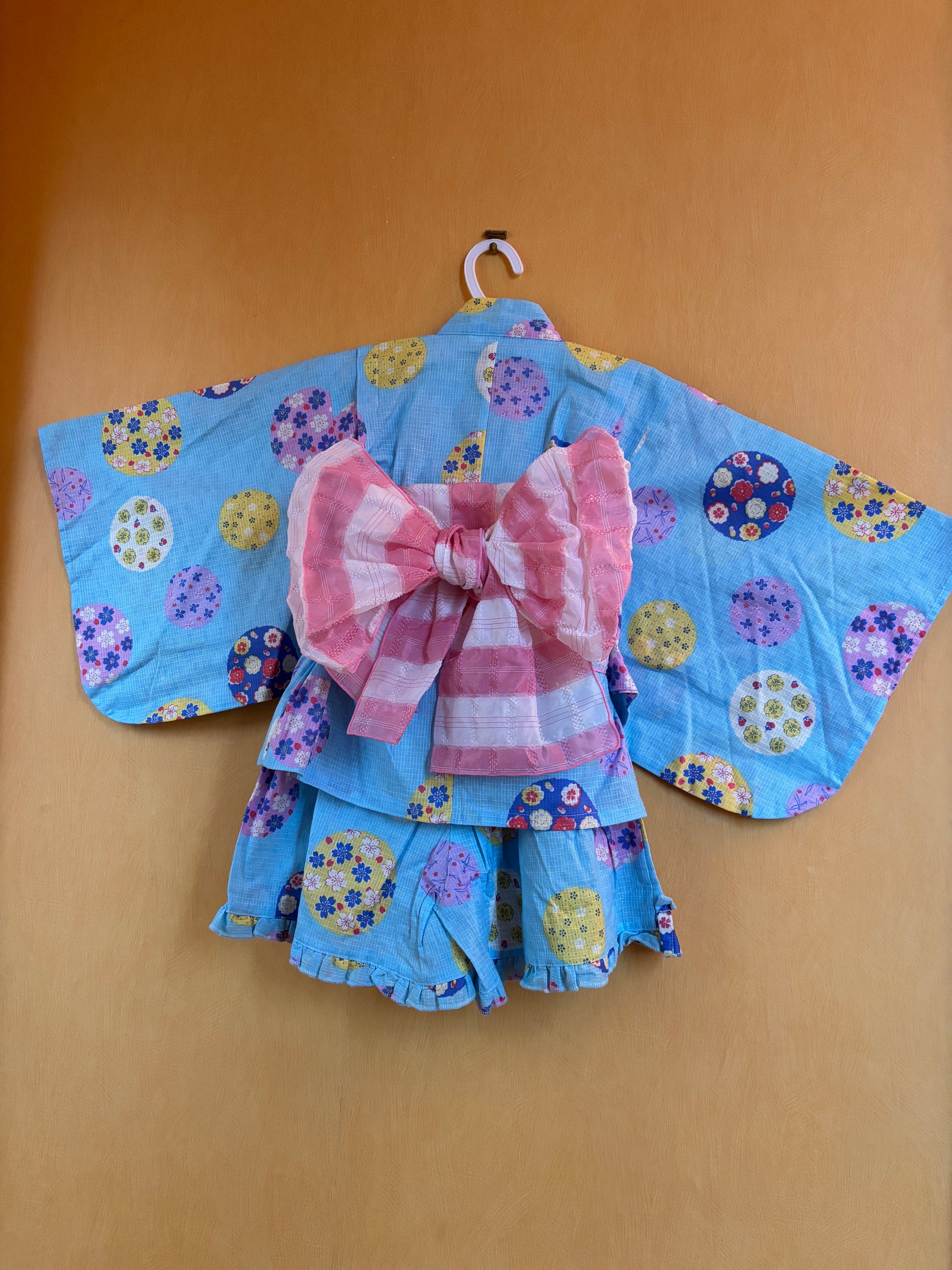 Cette jolie robe yukata pour enfants est composée de trois pièces : un haut, un short-jupe (culotte) et une ceinture à nœud.